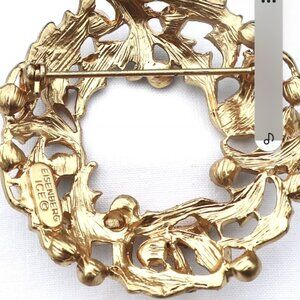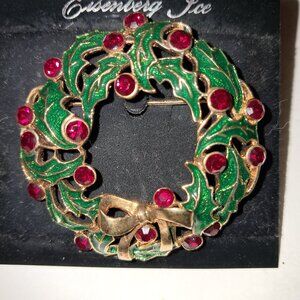 Beautiful Eisenberg Ice Red Rhinestones and Green Green Enamel Christmas Wreath Brooch. It signed on the back. It measures 2 inches in diameter.