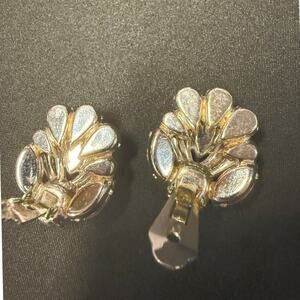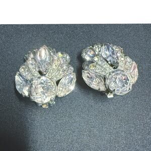 Just lovely pure 50s style vintage Eisenberg rhinestone clip on earrings. Gorgeous collection of shapes created endless sparkle. No discoloration to the stones. Closed back setting. One clip mechanism needs to be tightened. Minimal discoloration at the hinge not seen when worn.