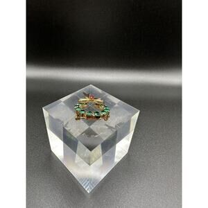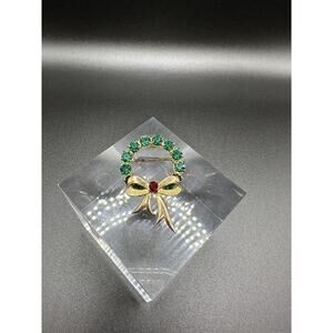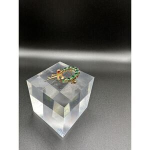 This brooch is in excellent condition! It is signed by Eisenberg Ice and is still on its original tag. It is a beautiful gold tone wreath with green rhinestones. It is finished with a bow and red rhinestone in the middle. It would make a beautiful gift for someone or yourself!