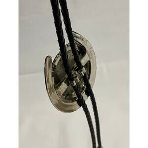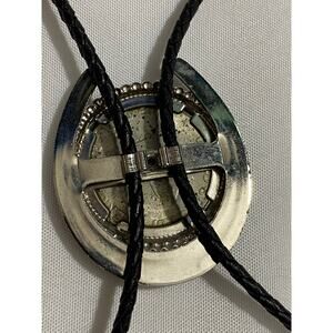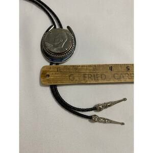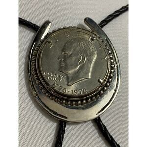 Striking vintage bolo tie featuring a 1976 Eisenhower bicentennial dollar coin centerpiece. Set in a classic Western-style mount with braided black cord and silver-tone tips. A bold accessory that blends Americana, history, and cowboy flair—perfect for collectors, patriotic events, or standout vintage styling.
