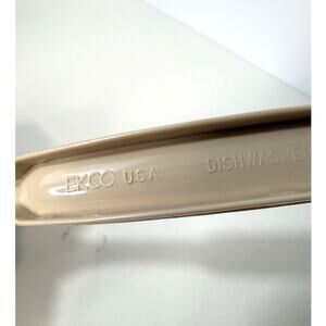 Vintage Ekco serving spoon in almond/tan color. Made in the USA of sturdy nylon plastic, marked dishwasher safe. Measures about 11 inches long. Pre-owned and used, shows light wear consistent with age and use, still in good condition.