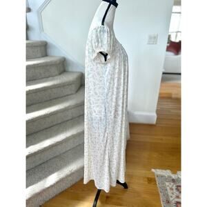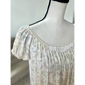 Excellent condition, missing inner tags. Regency style vintage nightgown. Cream white with small floral print. Gathered capped puff sleeve, scoop neck, lace trim. Cream lace with white lace center.