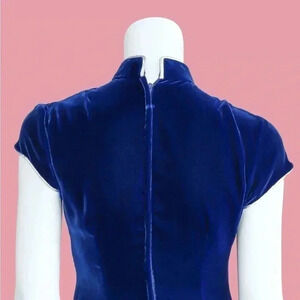 Vintage electric blue floral cheongsam pencil dress in size small. Floral velvet-like fabric with satin trim and a glitter floral design on the front and back. Mandarin collar with metallic silver decorative frog knots. Cap sleeves with a back zipper closure. Side slits at the hemline. Perfect dress for spring and summer.