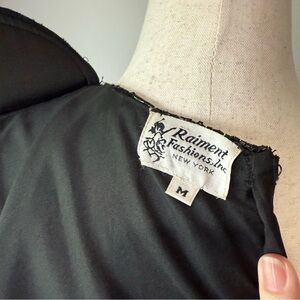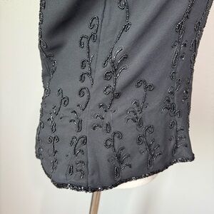 Elegant and timeless, this vintage black short-sleeve top by Raiment Fashions Inc. (New York) features intricate hand-sewn beaded embroidery throughout. The scoop neckline, sleeves, and hem are all delicately adorned with black beads in swirling vine patterns. Hidden back zipper closure and lightly structured silhouette give it a polished, flattering shape—perfect for cocktail parties, formal events, or vintage collectors.