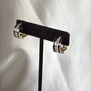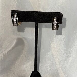 Elegant vintage clip-on earrings featuring a bold black enamel stripe and a sparkling center row of clear rhinestones set in a polished gold-tone metal. These chunky half-hoop style earrings bring a classic old money 1980s glam look—perfect for both formal wear and adding a statement to everyday outfits. Secure clip-on backs make them comfortable for non-pierced ears.