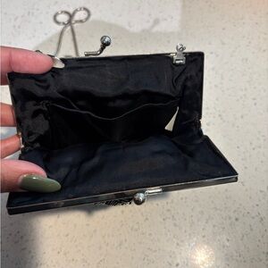 This stunning evening bag features intricate black and silver beading, perfect for adding a touch of elegance to any outfit. Ideal for special occasions.