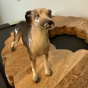This elegant greyhound figurine features a beautiful blend of brown and tan colors, perfect for any pet lover's collection. Its sleek design adds a touch of sophistication to your decor. It looks like a Hagen Renaker collectible piece but with the numbers on the underside, it looks more likely to be a Japanese made piece in accordance with other pieces that were similar to this dog. There are two small chips in the right ear. Possible leg repair.