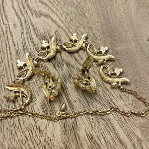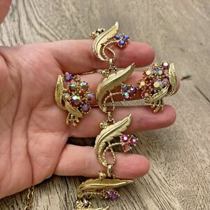 Vintage Mid Century Choker Necklace & Clip On Earrings Set - textured and dimensional gold tone setting with red AB finish rhinestones. The set resembles leaves & vines with berries dripping down - very elegant and pretty. No hallmarks but this set is nice quality costume jewelry. In excellent vintage condition - no damage or flaws.