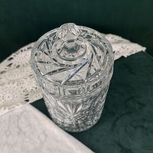 Beautiful crystal jar with intricate cut patterns. Comes with a matching lid. Perfect for decor or storage. The knob on the jar seems a little tilted.