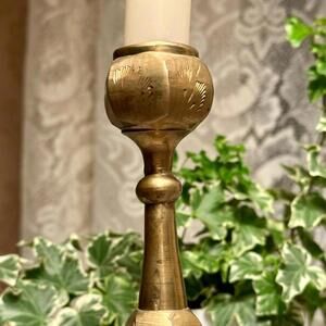 Add timeless elegance to your décor with this stunning pair of vintage solid brass candle holders. Beautifully crafted in India, each piece features a unique octagonal base and intricate hand-etched leaf and floral designs throughout the body and top. These candle holders stand approximately [insert height] tall and are perfectly suited for taper candles.