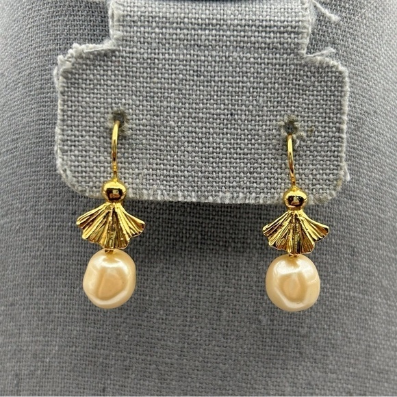 Vintage Elegant Gold Tan Fan Faux Pearl Dangle Earrings