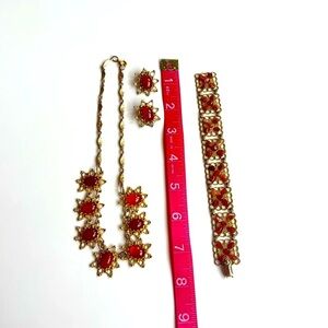 This vintage stunning jewelry set features a necklace, bracelet, and clip earrings in a beautiful gold and orange design. Perfect for adding a touch of elegance to any outfit. Not signed, the bracelet is not an exact match, it just compliments the set.