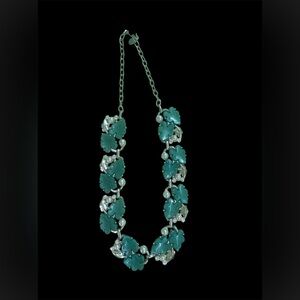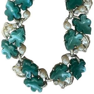 This very vintage 18” with a J hook clasp is a stunning necklace featuring a green leaf design, almost looks like shamrocks accented with faux pearls, and rhinestone’s perfect for adding a touch of nature-inspired beauty to any outfit.