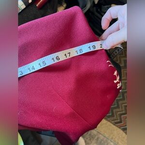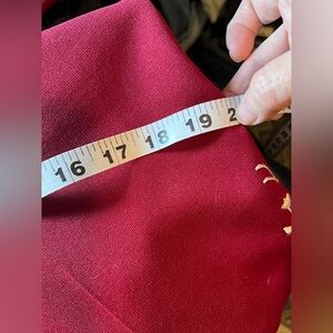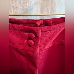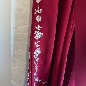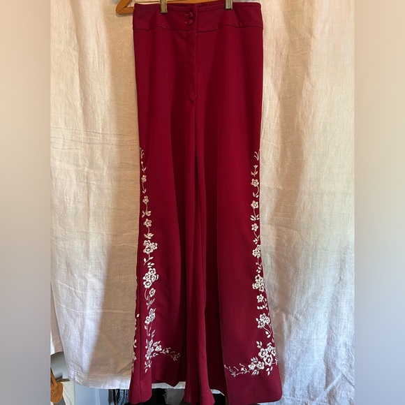 These elegant wide leg trousers in a vibrant red hue are adorned with intricate white embroidery along the sides, offering a sophisticated touch. Made from a flowing fabric, they provide a relaxed fit that combines comfort with style. The striking contrast between the red and white details enhances their chic appearance. Check photos for size.