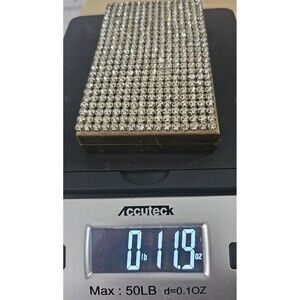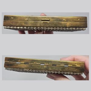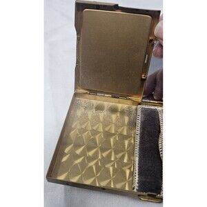 In good preloved condition, normal signs of use for age. There is still a little bit of powder and lipstick in the case. Heavy, weighs almost a pound. The mirror is actually a piece of metal that is spring loaded to hold cigarettes/cards or money in the top but the one side shows reflection well as if it was a mirror. Please feel free to ask any questions.