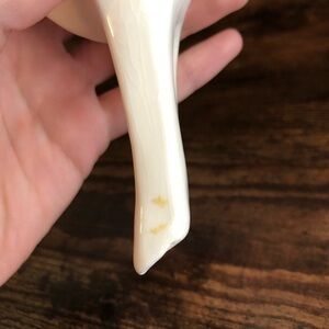 There are two small yellow stains on the front left foot. Let me know if you have any questions.