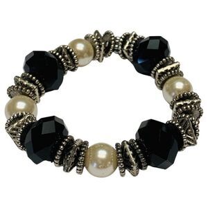 Vintage Elegant White Faux Pearl Black Sparkly Crystal Necklace Bracelet Set