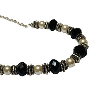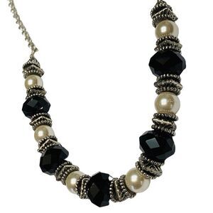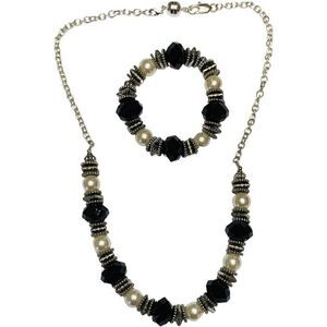 Vintage Elegant White Faux Pearl Black Sparkly Crystal Necklace Bracelet Set 23”