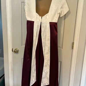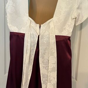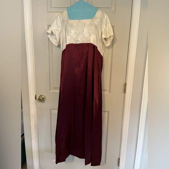 This elegant women's skirt features a sophisticated white and burgundy design, perfect for any occasion. The stylish color combination adds a touch of class to your wardrobe. This dress was handmade for me in 1999. Worn once and dry cleaned after use. Please see pictures. Couple small marks I tried to show in pictures. Approximately size 16-18.
