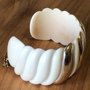 Up for sale is an elegant old vintage wide scalloped Cuff Bracelet with 14k Gold accents and a Safety Chain. The chain clasp is marked 585. The bracelet is 1 1/4" wide and weighs approximately 49.1 grams.