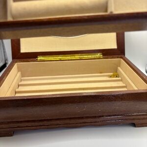 This elegant wooden jewelry box features a rich brown finish and a convenient mirror inside. Perfect for organizing your precious items with style.