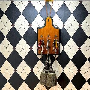 A petite yet polished accent for the thoughtfully curated home—this vintage wooden key holder adds timeless charm with its warm wood grain, elegant design, and six gleaming gold-tone hooks. At just 5” x 6”, it’s perfectly sized to tuck into an entryway, mudroom, or beside a favorite antique door.