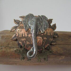 A unique mixed-metal brooch featuring a detailed silver elephant design with copper and brass accents, complemented by dangling baby elephant charms for movement.