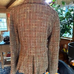 vintage tweed blazer with button closure. Elegant design with textured fabric. Perfect for layering.
