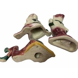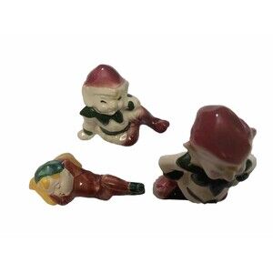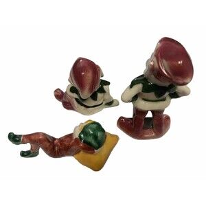 This vintage set of three figurines features whimsical elf, pixie, and gnome characters in shades of green and maroon. In great vintage condition no chips or cracks.