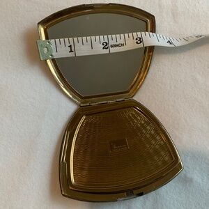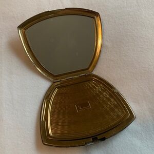 Beautiful vintage clam shell compact, gold tone metal. The engraving is faded. But it's still lovely the way vintage things are.