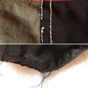 Great color-blocking! Full zip w/ velcro closure flap on top. 2 front zip pockets. Adjustable drawstring at waist. Inner adjustable velcro stretch waistband. 1 interior zip pocket. Removable snap hood w/ drawstring. Size/care label too faded to read.
