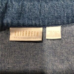 Preowned Elisabeth by Liz Claiborne denim jacket. Size 2. Good condition. Button down but is missing the top button. (See picture) It has 2 large side pockets and side buckles. It does seem to run larger than a 2 because I wear a medium and it’s roomy on me. The measurements are 25” from armpit to armpit, 19” from shoulder to shoulder, 25” from shoulder to hem and the sleeves are 24” from shoulder to hem. There is a Velcro strip for shoulder pads which is not included. It is medium blue, 100% cotton.