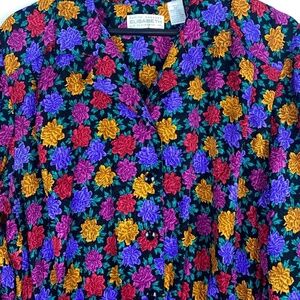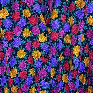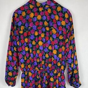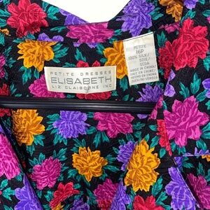 Vintage Elisabeth Liz Claiborne 100% Silk Black Floral Button Down Long Sleeve Midi Dress 16 Petite EUC. In excellent condition without rips, tears or stains. All buttons are intact and work well. Elastic waist. When laid flat this dress measures 25” across from pit to pit, the elastic waist measures 15” across, and it has a length of 51”.