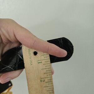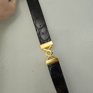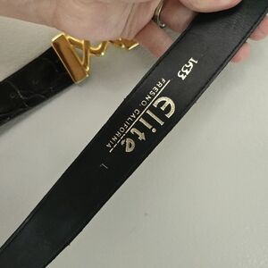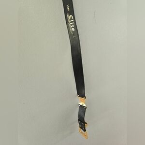 Elegant black leather belt featuring a striking gold buckle. Perfect for adding a touch of sophistication to any outfit.