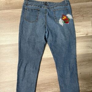 Vintage Elite Jeans Women’s Size 17/18 – Distressed Denim with Embroidered Flaming Heart & Wings