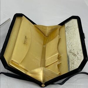 - Black Velvet outside with a golden yellow satin interior which features a mirror, four slip in pockets and a snap pocket