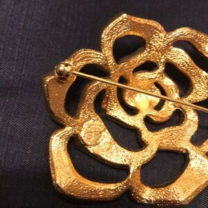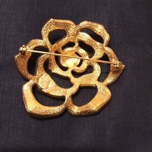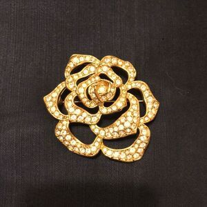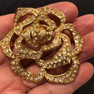 Vintage 1990 Elizabeth Taylor crystal rhinestone and gold tone rose pin brooch . Marked Avon. This brooch is 2 1/2” wide. VGUC vintage condition. Thanks for looking.