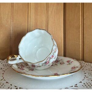 This vintage fine bone china teacup and saucer set by Elizabethan features an elegant pink rose floral design with gold trim. A timeless collectible piece.