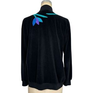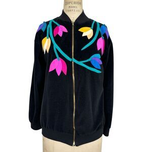 Vintage Ella Manfredi Women's Velour Track Jacket Small Black Floral USA Granny