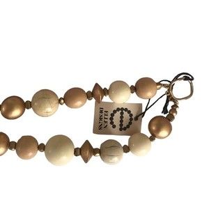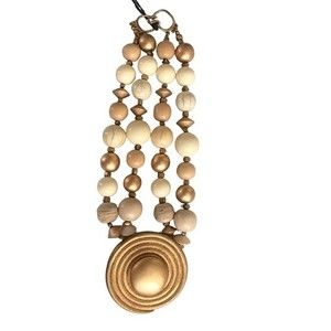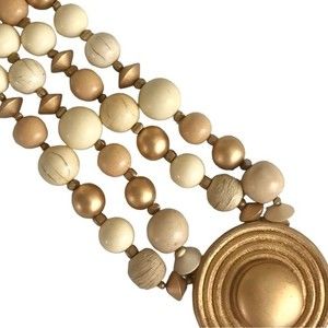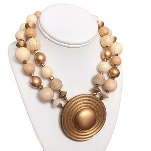 Vintage Ellen Designs Statement Necklace - New Old Stock. I’m not sure of materials; I think it’s acrylic and wooden beads some with gold gilt. Measures approximately 16”. Pendant is approximately 2” diameter.
