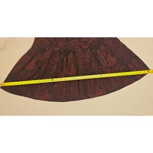 Measurements: 22in Long. 32in Bottom Width. 15in Waist. This beautiful vintage Ellen Figg skirt features a rich brown and deep rust paisley tapestry print on a structured pleated silhouette. Made in the USA, this high-waisted A-line skirt is crafted from a 50% cotton, 50% rayon blend that gives it a soft yet substantial feel. The front pleats create a flattering shape with gentle movement while maintaining a tailored, classic look. The side zipper and button closure are fully functional, and the waistband sits comfortably at the natural waist. The color palette of earthy browns, burgundy, and black makes this an ideal fall and winter piece that pairs well with sweaters, blazers, boots, or tights. This skirt is labeled a size 14, but as with all vintage garments, please refer to measurements for best fit. From the late 1980s to early 1990s manufacturing.