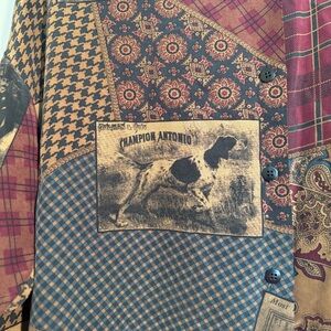 Stylish patchwork button-up shirt with a mix of patterns. Features red, blue, and brown tones.