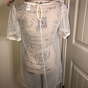 It has a cute polka dot trim thru out the top & it is a flowly Top as well.
