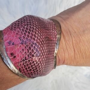 Real pink variegated color snakeskin on a metal cuff. I polished the interior.