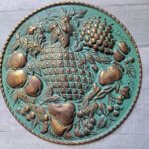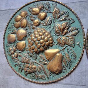 Vintage Elpec England Brass Wall Plaques With Fruit Embossing 11" Diameter Set O