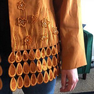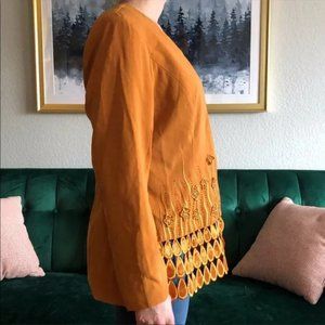 Elevate your wardrobe with this vintage Elsa Loraine blazer, perfect for women who love a pop of color and fun. The blazer features an open front and beautiful floral embroidery that adds a touch of botanical and happy vibes to any outfit. It comes in a size 12 and has shoulder pads. This one-piece blazer is a must-have for anyone who wants to add a statement piece to their clothing collection. It is ideal for any occasion and can be paired with different outfits to create a unique and stylish look. The blazer is in great condition and is sure to make any fashion-savvy woman happy. Measurements laying flat are listed below.