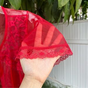 Vintage Elsie of Miami Red Sheer Babydoll Peignoir Robe 🌹. Completely sheer flowy mesh with lace detailing along the neckline + sleeves and a dainty tie front closure. Gives complete romantic, cottage core,dainty, retro , feminine , dreamy , coquette, boudoir, vintage lingerie vibes. So beautiful layered over a slip dress, or worn on its own for that soft ethereal look.