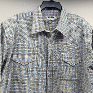 Vintage Ely Cattleman Pearl Snap Shirt Mens 17.5 Blue Yellow Plaid Western Short