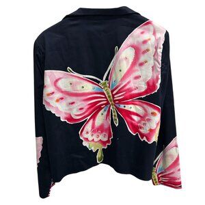 Vintage Elyse Hart Ltd Butterfly Print Navy Jacket Vibrant Pink Accents Sz Large