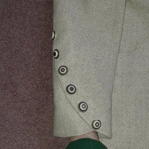 Suit itself is a wool/silk blend. Size & content tags removed. It is a size 10 (tried and measured)
